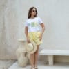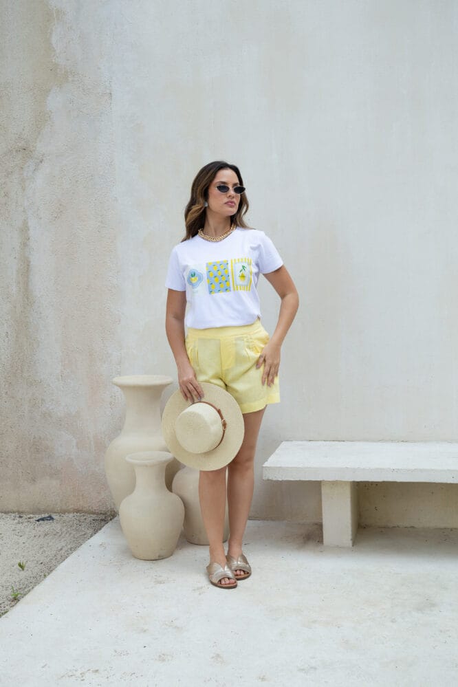 A estampa frontal traz um mix de elementos ilustrados com limões sicilianos, florais delicados e listras amarelas, formando um painel criativo, tropical e cheio de personalidade. Um convite visual aos dias ensolarados!