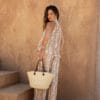 O destaque fica por conta da estampa em tie-dye manual, com tons terrosos e fundo claro, que traz um ar natural e moderno à peça, ideal para looks frescos, casuais e elegantes ao mesmo tempo.