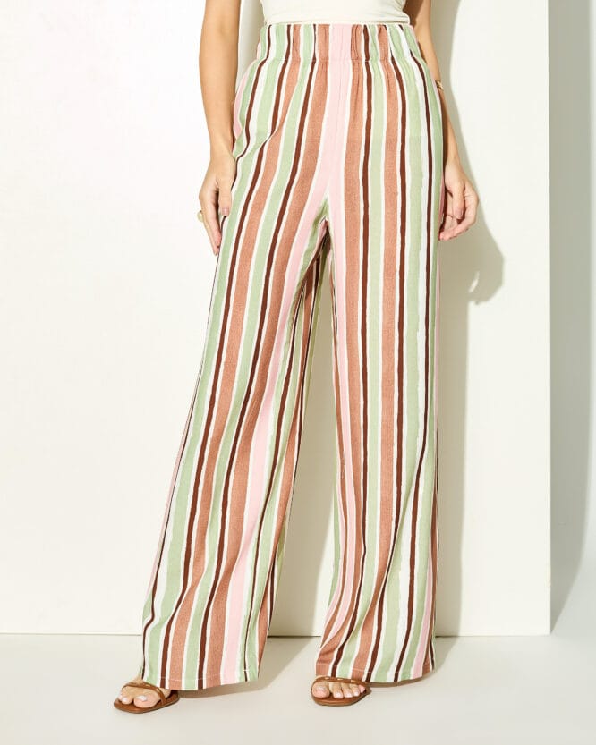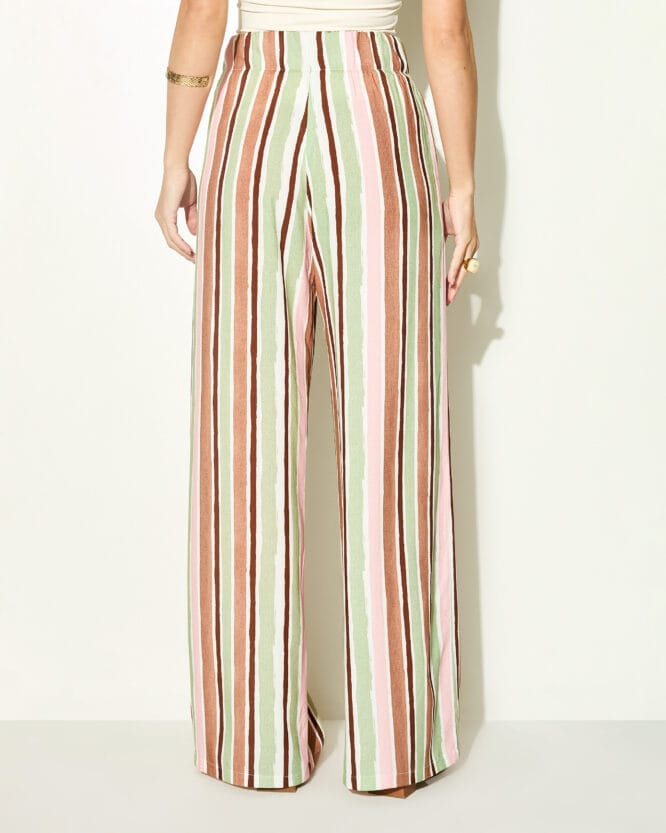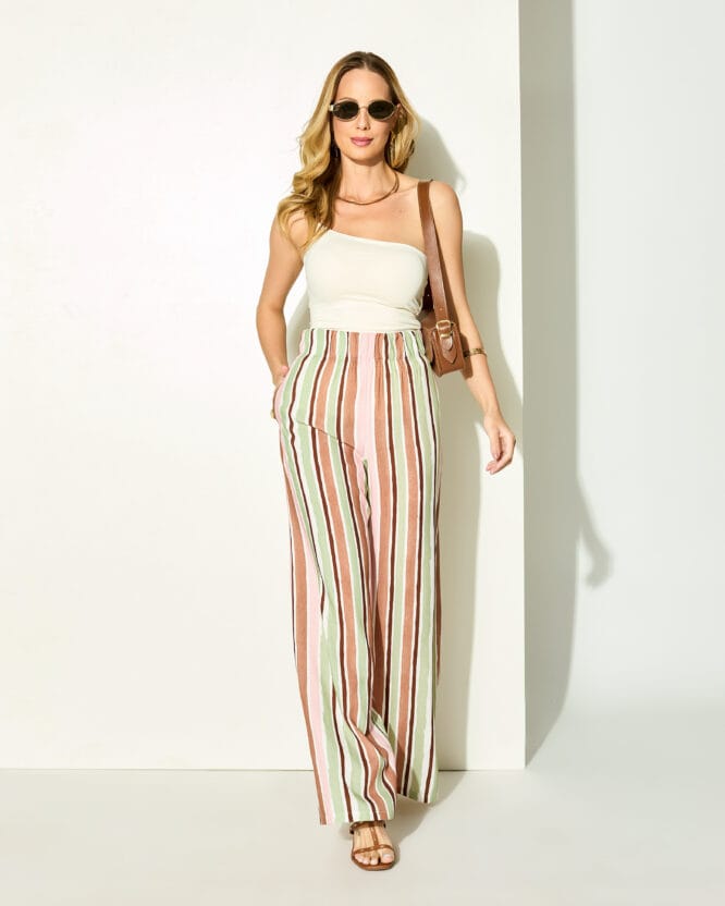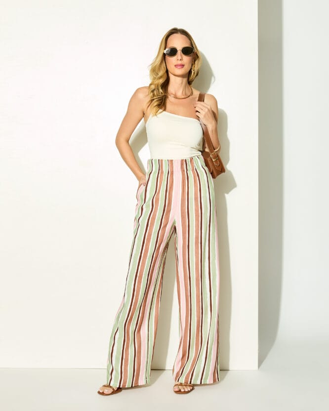 As listras verticais em tons de verde, marrom, rosa e off-white alongam a silhueta e criam um visual moderno e descontraído, ideal para looks de verão com estilo. Combine com regatas, bodies ou croppeds para um visual leve, fresco e elegante.
