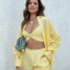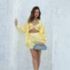 O Top Molly é feito em malha canelada de poliamida com elastano. A peça traz bojo embutido para sustentação confortável e alças finas fixas que valorizam o colo com leveza. O destaque fica por conta do torcido frontal, que cria um efeito moderno e delicado. O tecido canelado realça a textura e garante elasticidade, ideal para dias quentes e produções casuais com um toque sofisticado.