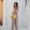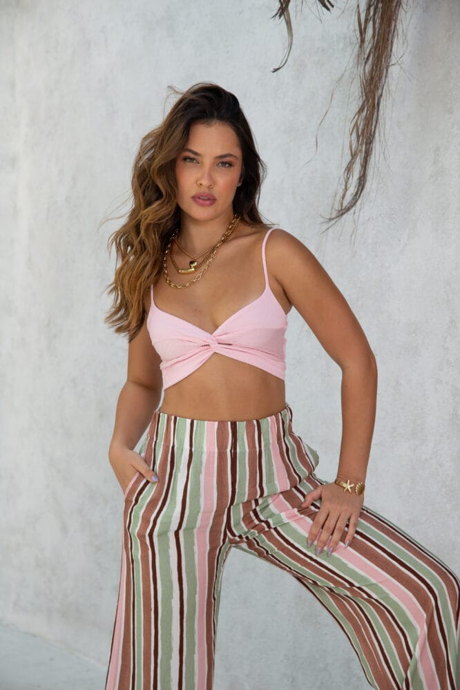 O Top Molly é feito em malha canelada de poliamida com elastano. A peça traz bojo embutido para sustentação confortável e alças finas fixas que valorizam o colo com leveza. O destaque fica por conta do torcido frontal, que cria um efeito moderno e delicado. O tecido canelado realça a textura e garante elasticidade, ideal para dias quentes e produções casuais com um toque sofisticado.