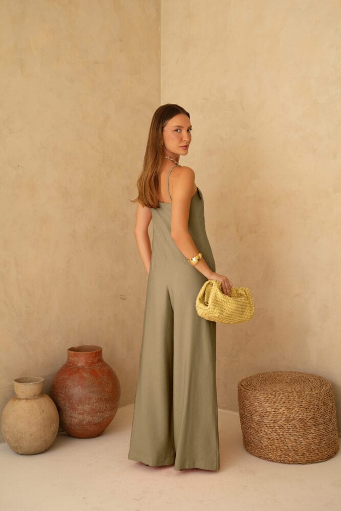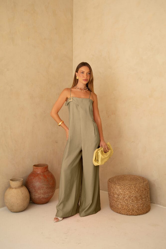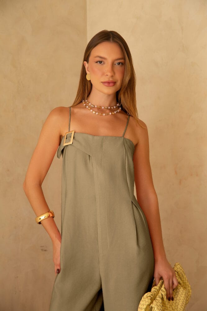Macacão em alfaiataria, pantalona, alças reguláveis e fechamento por zíper na lateral. Destaque para o detalhe no busto, com uma fivela imitando cinto e uma vista que acompanha o busto até o cavalo do macacão. Uma peça elegante e moderna!