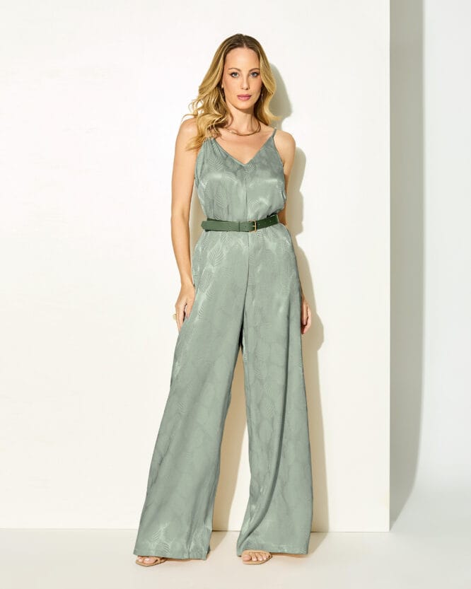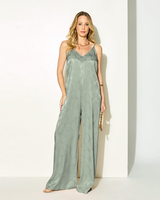 O Macacão Una é confeccionado em 100% viscose, com textura suave e caimento fluido que acompanha os movimentos com leveza e elegância. A modelagem ampla e reta proporciona um visual sofisticado e moderno, enquanto as alças finas ajustáveis e o decote V valorizam o colo com delicadeza. O brilho discreto e o desenho em relevo na própria trama do tecido tornam a peça ainda mais especial, ideal para ocasiões que pedem charme com conforto.