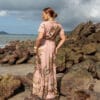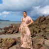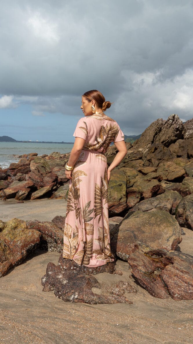 O Vestido Kelly é confeccionado em viscose 100%, um tecido leve, fresco e com excelente caimento, perfeito para os dias mais quentes. A estampa de folhagens em tons terrosos sobre o fundo rosado traz um ar tropical e sofisticado ao visual, com um toque artesanal que remete à natureza.